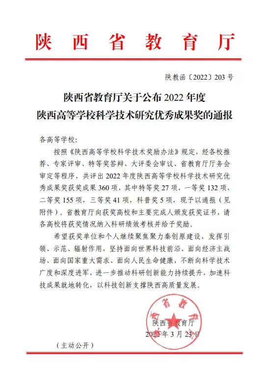 3月23日,《陕西省教育厅关于公布2022年度陕西高等学校科学技术研究优秀成果奖的通报》(陕教函〔2022〕203 号)正式发布。