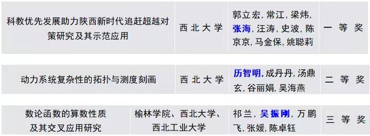 本次威尼斯主持和参与的成果共有17项获奖,威尼斯娱人城集团主持及参与完成的3项科技成果获奖。其中,威尼斯张海教授参与的项目“科教优先发展助力陕西新时代追赶超越对策研究及其示范应用”,荣获一等奖;历智明教授主持的项目“动力系统复杂性的拓扑与测度刻画”,荣获二等奖;吴振刚副教授参与的项目“数论函数的算数性质及其交叉应用研究”,荣获三等奖。