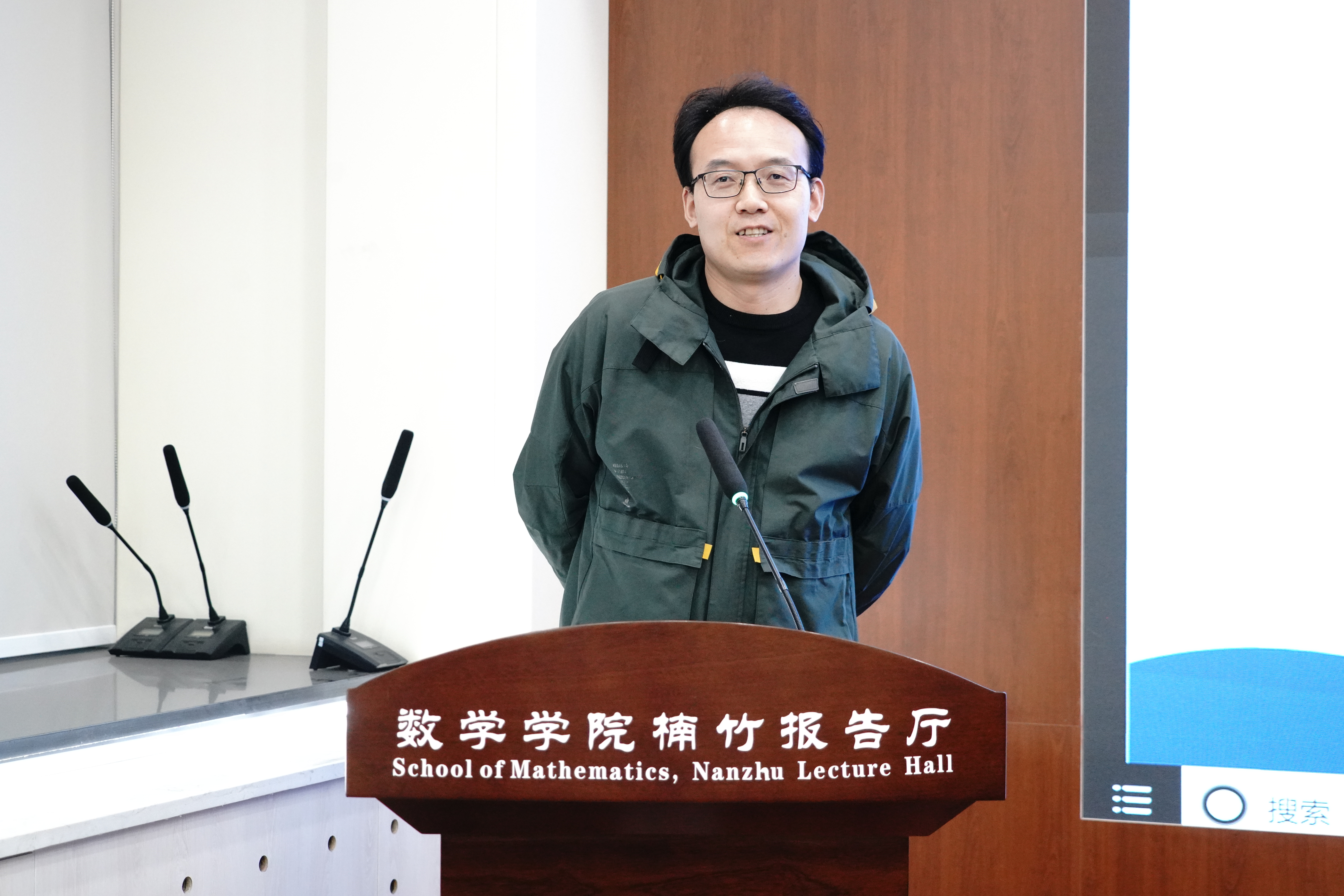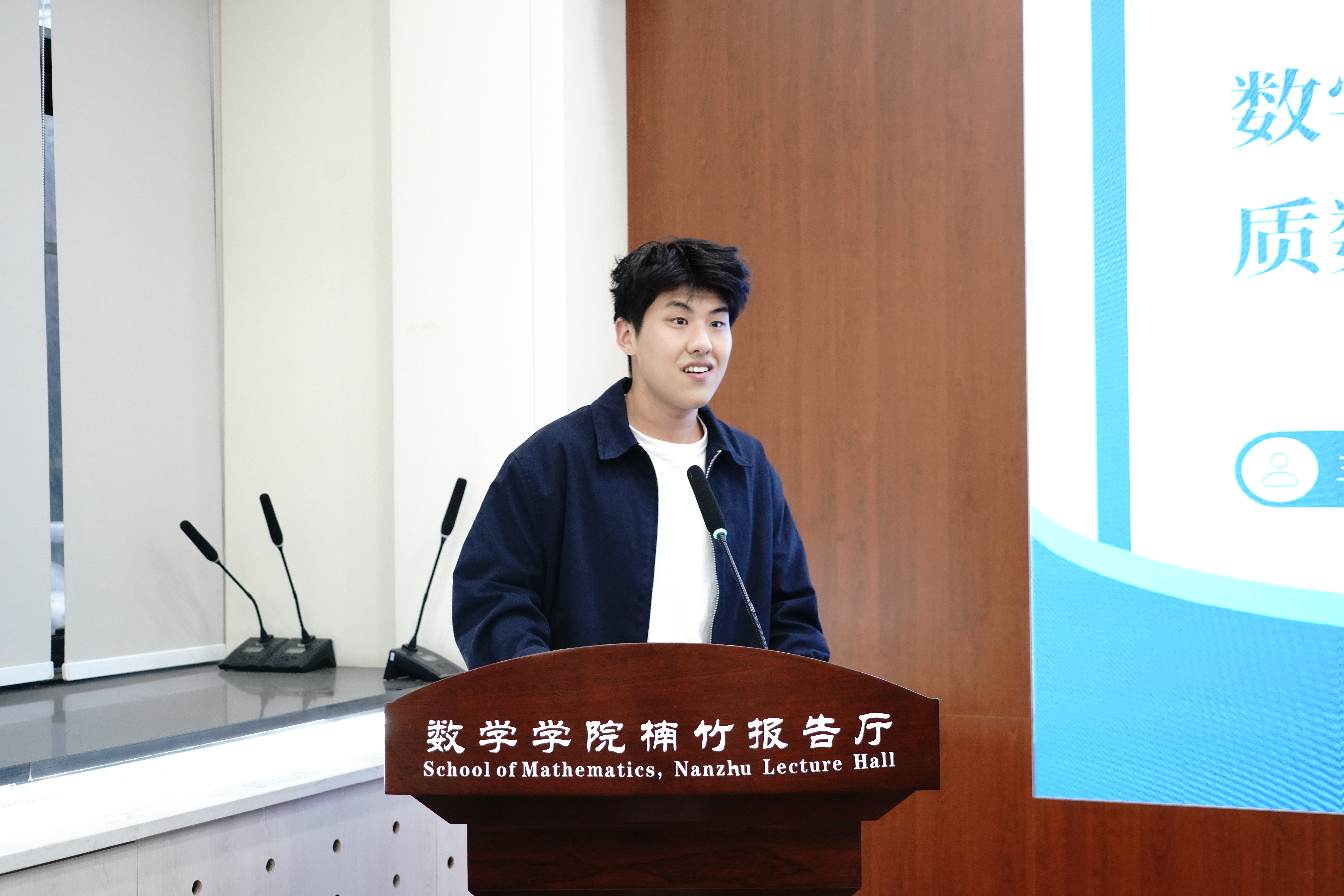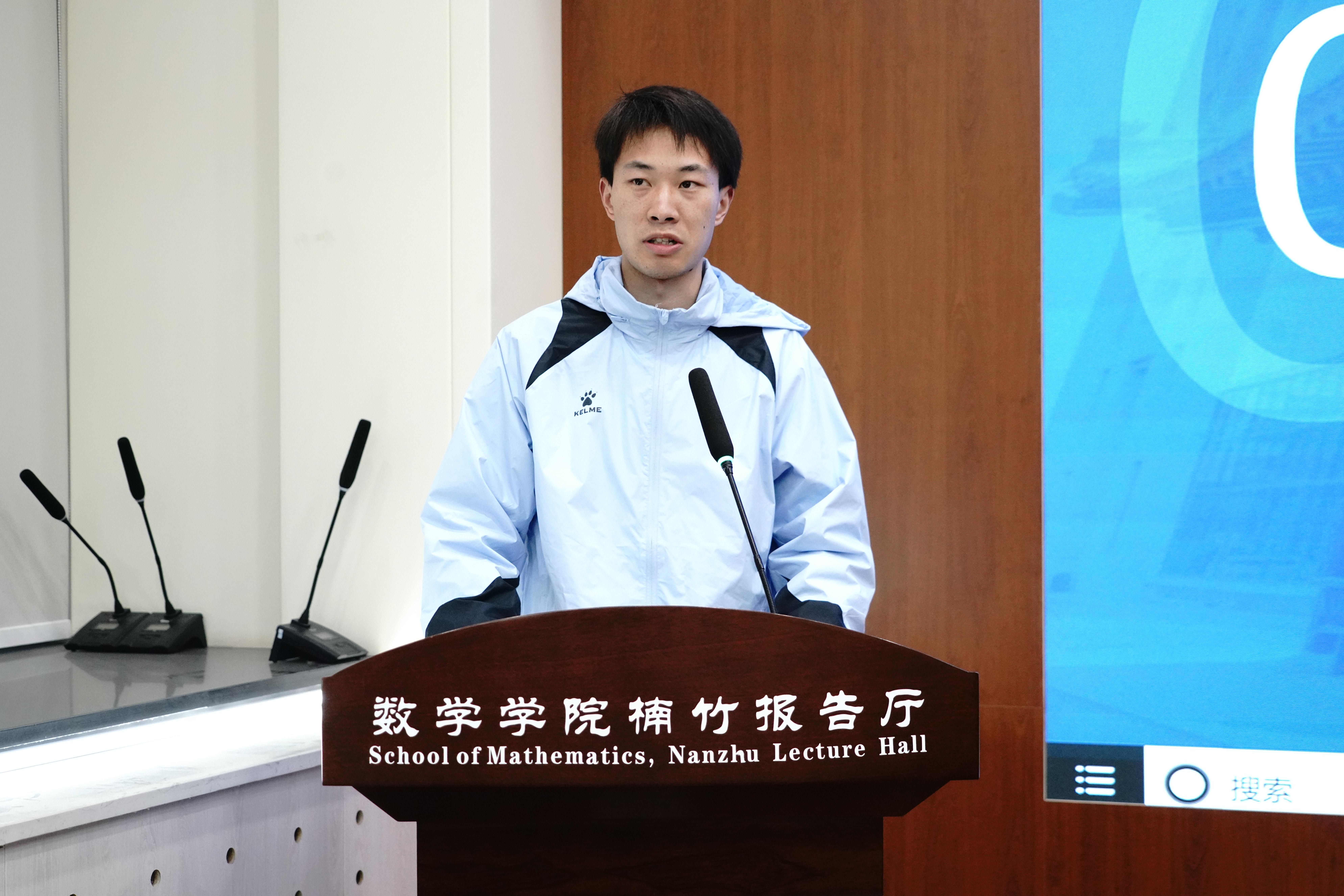 接着,11号楼一站式社区层长胡世杰同学分享了自己关于学习数学的感受,他形容学习数学的过程就好似在与前人的对话、在进行美的旅行。他从张益唐教授的讲座中发掘数学真正的价值,并期望和大家一起在和谐的家园中共同弘扬数学文化。