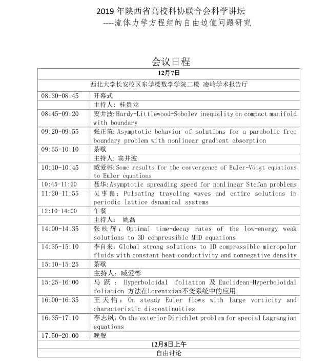 学院将于2019年12月6-8日在学院凌岭学术报告厅举办2019 年陕西省高校科协联合会科学讲坛—流体力学方程组的自由边值问题研究,欢迎各位老师参加。