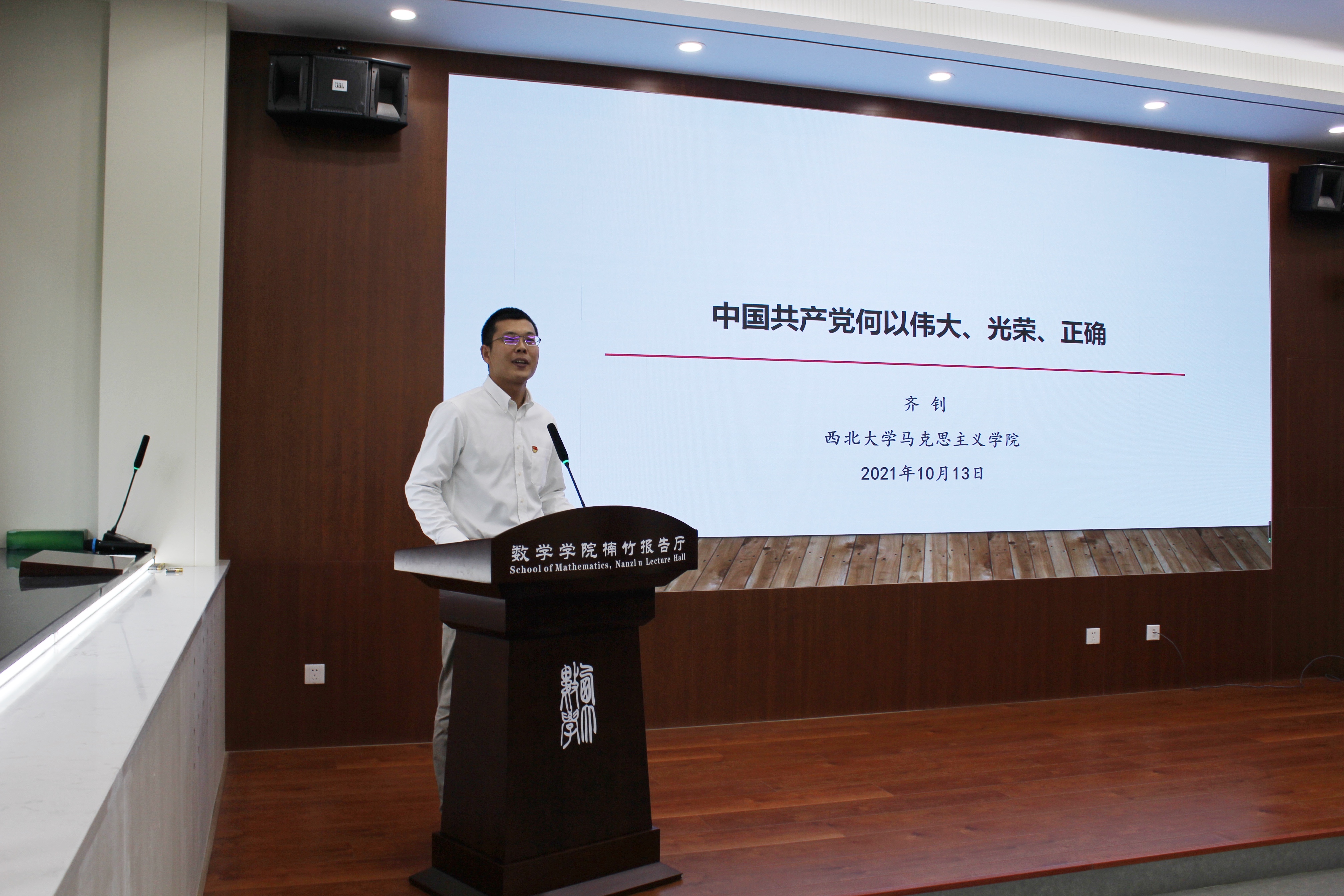 10月13日下午,威尼斯邀请校党史学习教育宣讲团成员、马克思主义学院副教授齐钊作了“中国共产党何以伟大、光荣、正确”专题报告。学院行政支部全体党员、学生支部书记、全体团干以及100余名学生代表参加了报告会。报告会由学院学生工作负责人主持。
