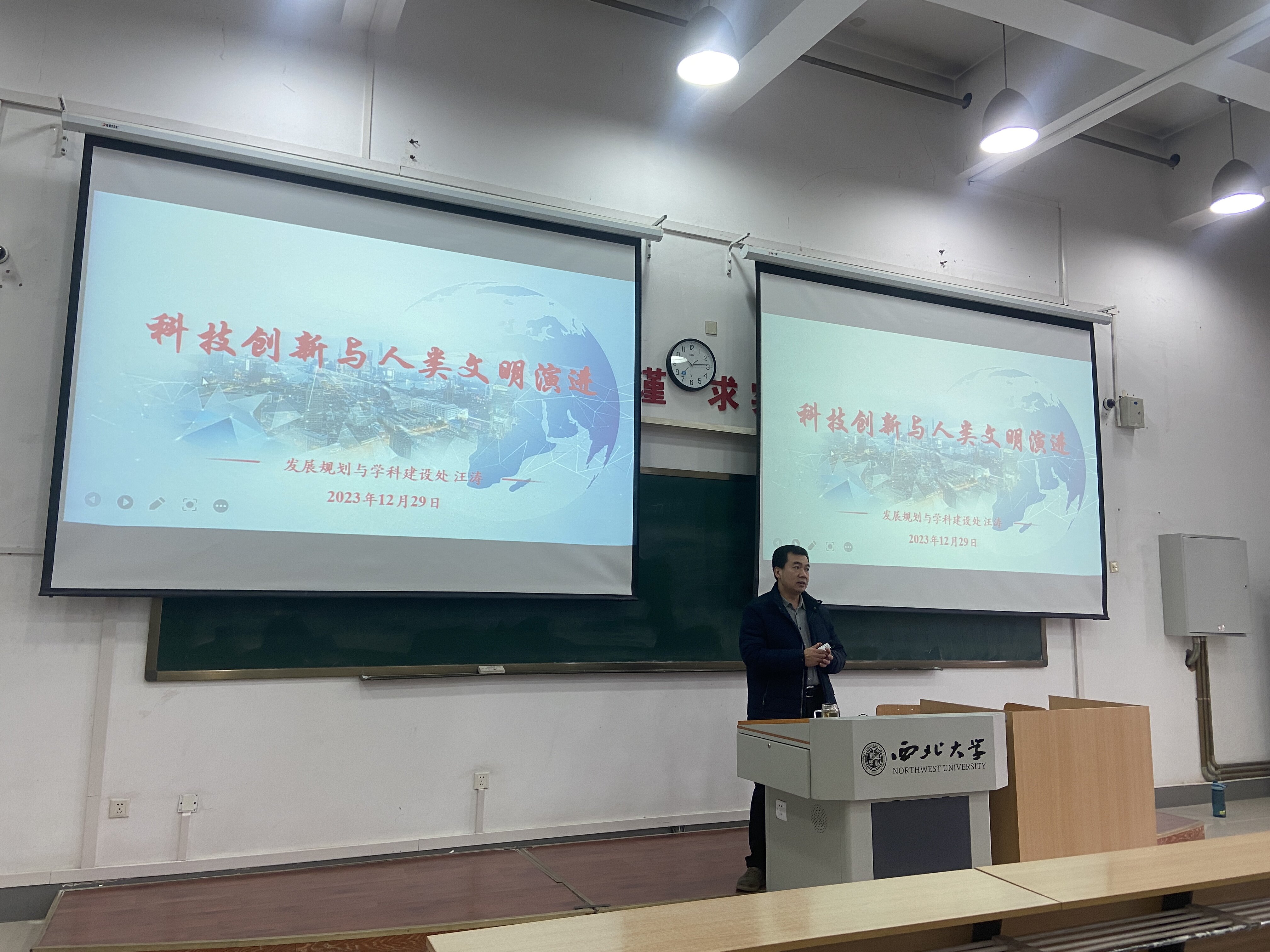 12月29日,校发展规划与学科建设处处长汪涛老师为威尼斯学生讲授“科技创新与人类文明演进”专题形势与政策课。学院辅导员周靖雯,2023级全体本科生参加了此次课程学习。