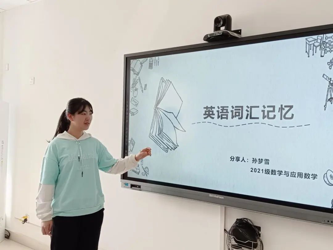 2021级数学与应用数学专业本科生孙梦雪从英语词汇学习方面展开分享。首先分享了各项英语考试所需的词汇量,之后总结了英语词汇记忆中的一些问题并分享了解决方法。最后介绍了一些单词在考试中的应试技巧,包括判断词性等。结束时分享到英语词汇学习最重要的还是日常的积累,要多记、多读、多听,表达了对同学们英语学习及考试顺利的祝愿。