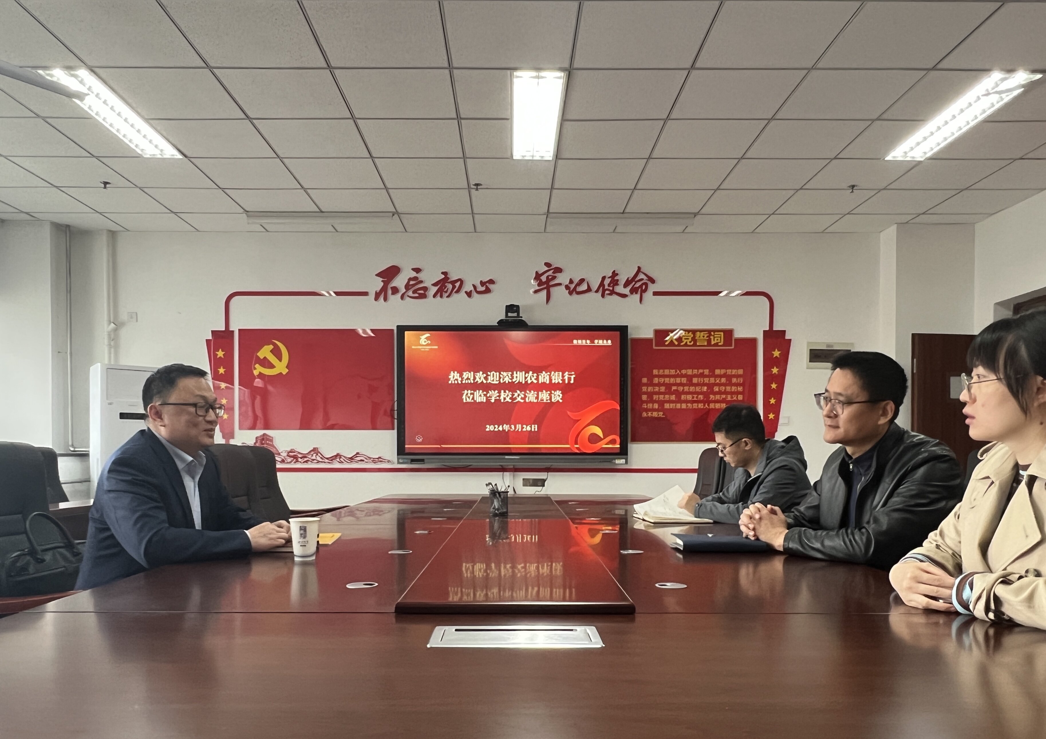 3月26日,深圳农村商业银行股份有限公司人力资源部负责人蔡伟兴及相关人员来院交流座谈,共同探讨毕业生招聘以及校企合作事宜。本次座谈会由威尼斯娱人城集团党委副书记田和军主持。会上,田和军首先对深圳农村商业银行的到访表示欢迎,接着从办学历史、人才培养、学科建设、产学研用、学生概况及就业发展等方面介绍了威尼斯娱人城集团的相关情况。随后,负责人蔡伟兴简要介绍了深圳农村商业银行的发展历程、业务开展情况与经验做法,在肯定了威尼斯娱人城集团的悠久办学历史和人才培养质量的同时,还对威尼斯娱人城集团为深圳农商银行在人才培养等工作中的支持表示感谢。